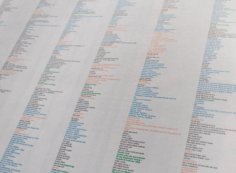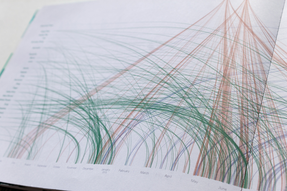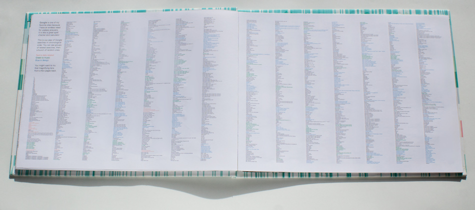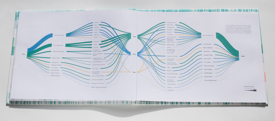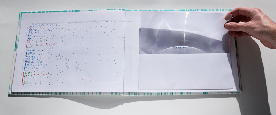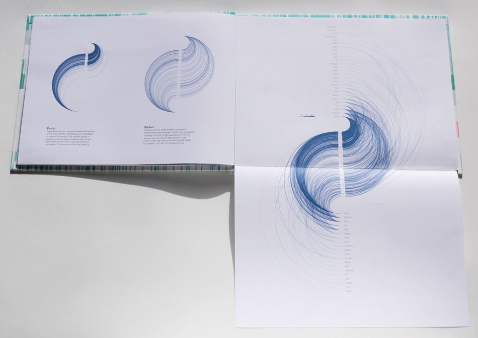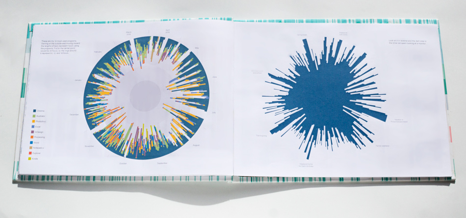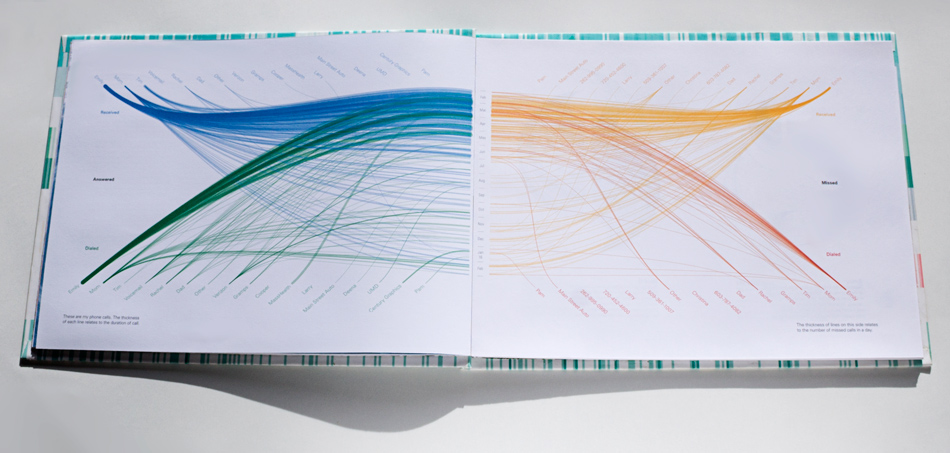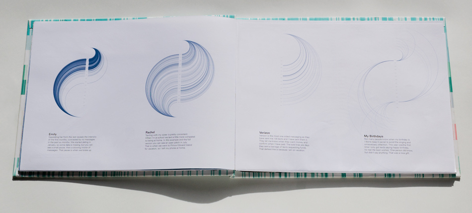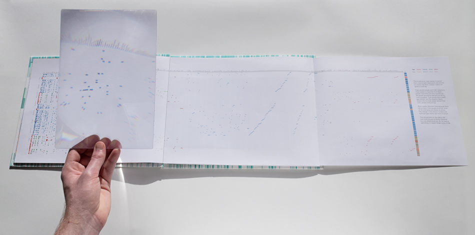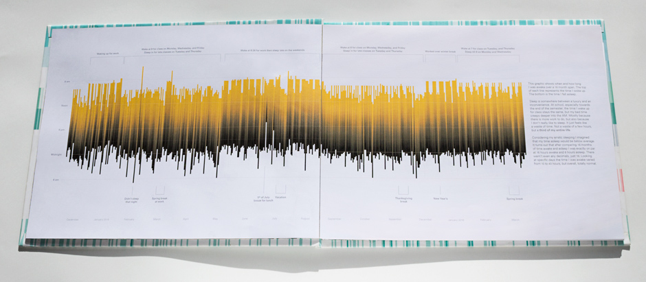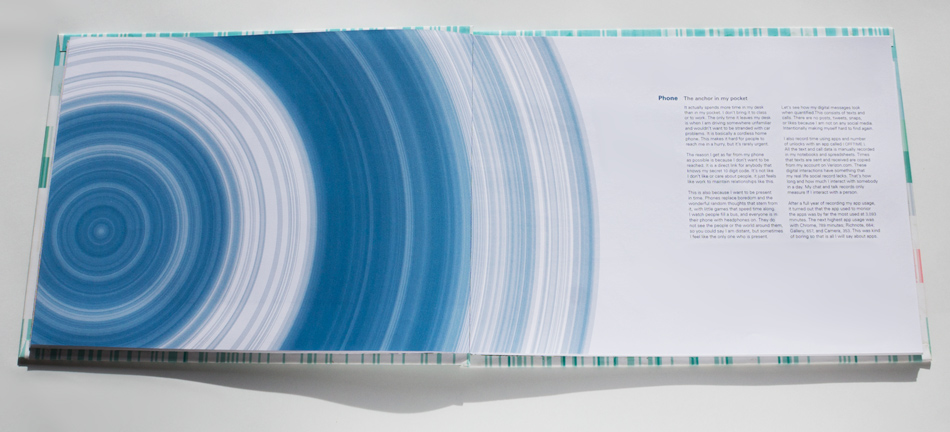 This book is an exploration into the way information is understood and the beauty numbers can have. The data represents about 2 years of daily recording of time I woke up, who I talked to, books read, texts send and received, drinks drank, Google searches, and much more. Visualizing numbers as shapes and colors reveal hidden patterns.